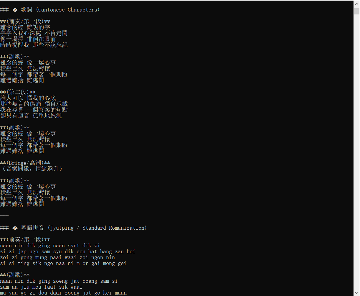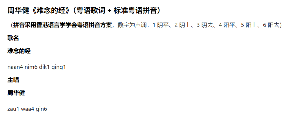 歌名:难念的经 ------ naan4 nim6 dik1 ging1