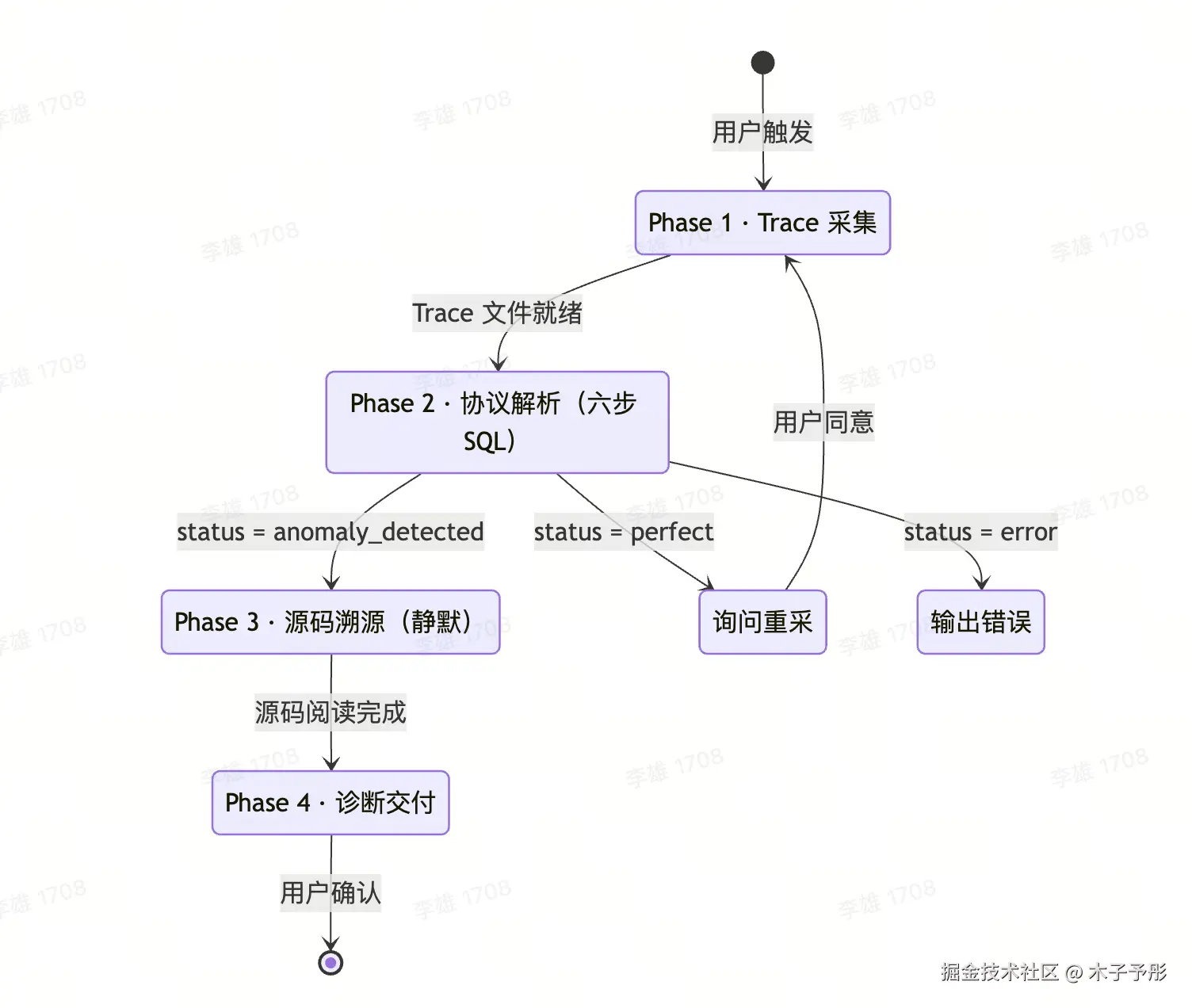 V2 升级为 IDE Agent 原生融合:砍掉了 3_ai_reporter.sh 和 run_profiler.sh,只保留 2_trace_filter.py 作为分析底座,源码溯源和诊断推理全部由 Agent 在本地完成------源码不外传、API Key 不暴露。Agent 自动完成从采集到诊断的全流程,输出带源码引用的修复建议,询问用户是否需要执行代码修改。