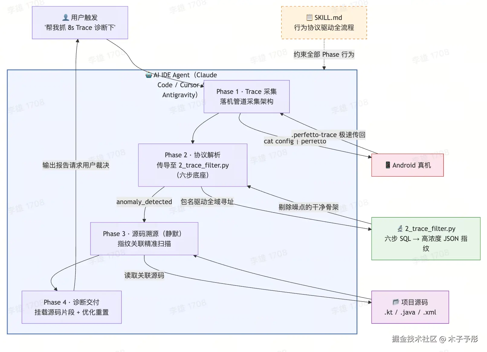 一句话概括: 用户说一句话 → Agent 在真机上采集 Trace → 2_trace_filter.py 六步 SQL 管线提纯为 JSON → Agent 按 JSON 线索搜源码 → 读完后交付诊断报告与修复建议 → 询问用户是否需要修改代码。