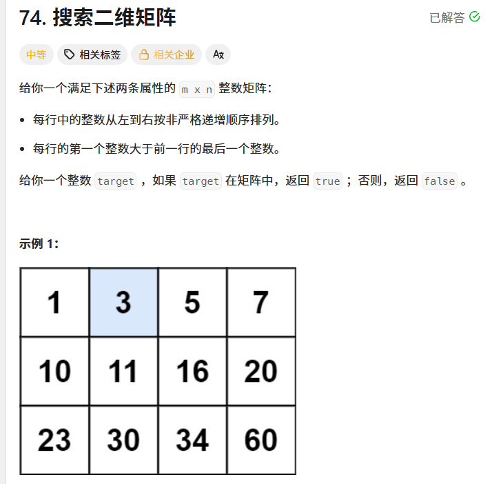 target = 3:mid最终命中索引1,对应row=0, col=1,返回true - 查找