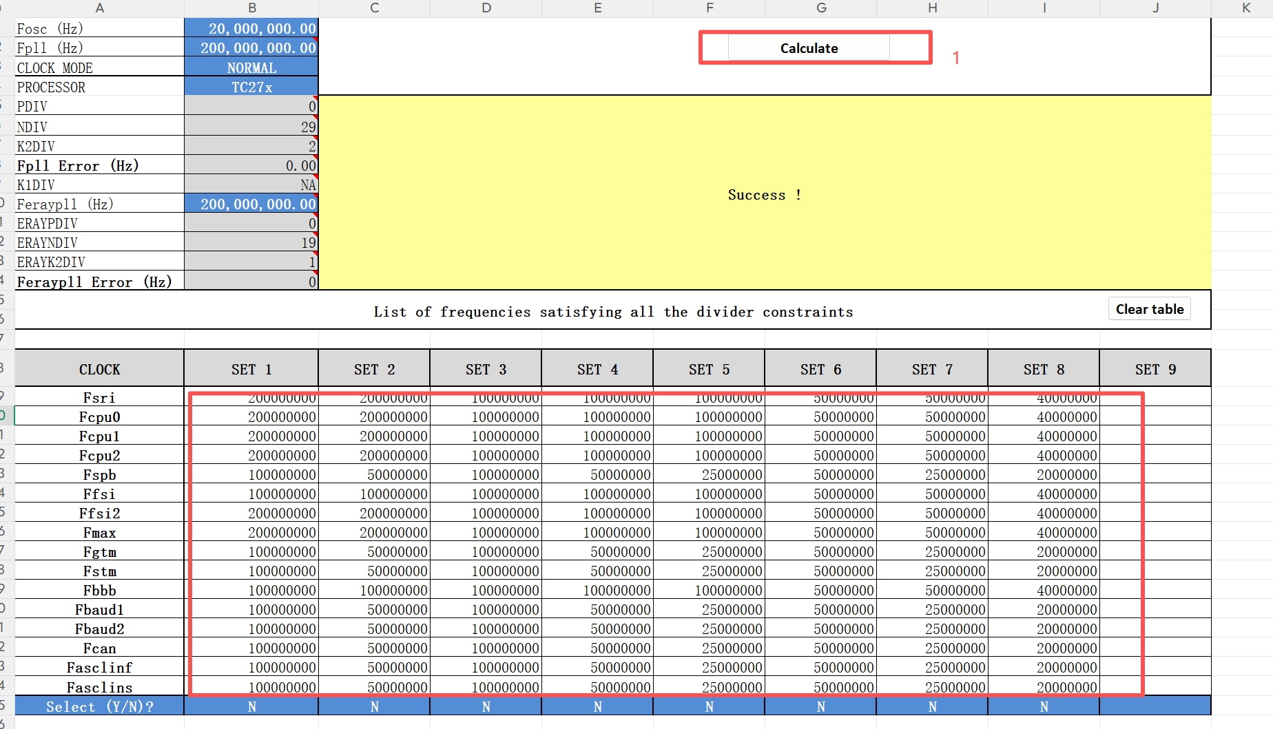 5、在生成的时钟频率下,选择一种想要的一列,输入"Y",可以根据"RESULTS"表中参数配置EB中的时钟参数。