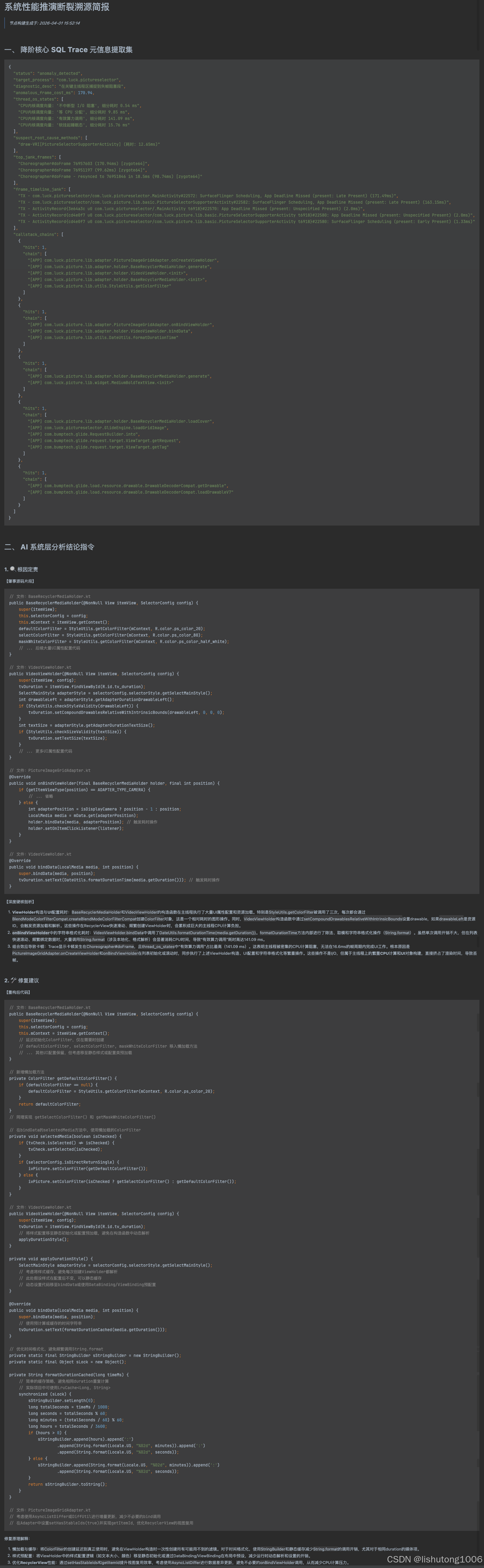 经过强约束模板调优后,即使是复杂的嵌套布局或第三方列表滑动卡顿,AI 引擎也能精准输出肇事源码片段与针对性修改建议: