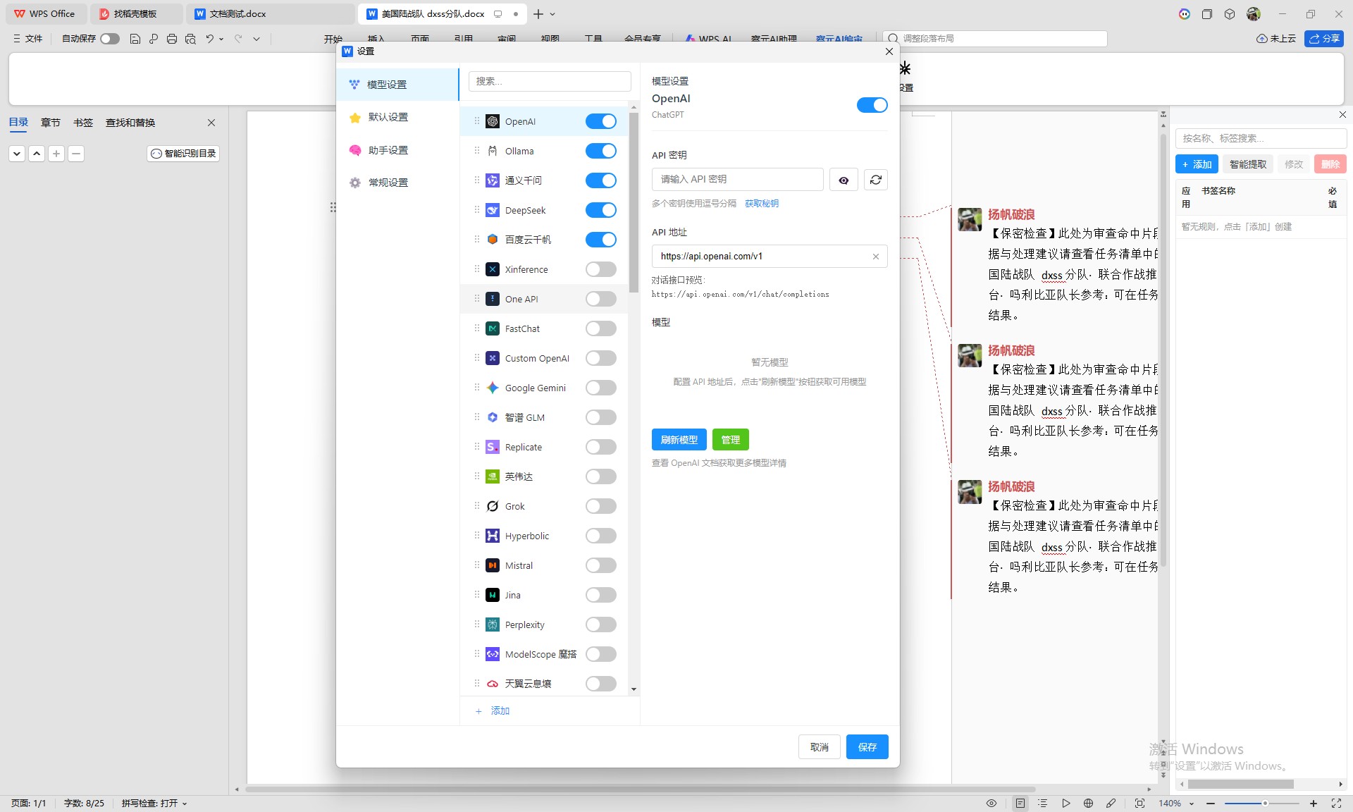 不少单位禁止终端长期依赖外网 CDN 或在线脚本。仓库提供在线与离线打包变体,例如 README 中的 npm run build:wps-offline,离线包将 Web 资源一并分发,便于内网或隔离环境部署;推理可指向本机或机房内 OpenAI 兼容服务,例如 Ollama、LM Studio、Xinference、OneAPI,减少全文经公网 SaaS 的路径。是否满足安全测评须结合网络拓扑与日志策略单独评估。
