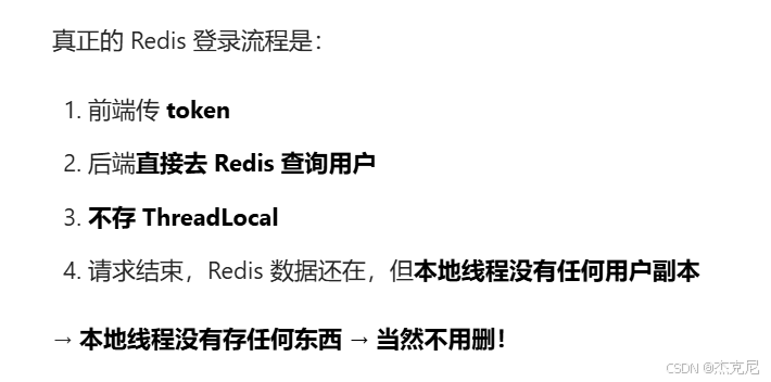 因为用户信息存在 Redis 里,而不是存在 ThreadLocal 里了! 你现在这个拦截器根本没往 ThreadLocal 存用户 ,自然就不用删!