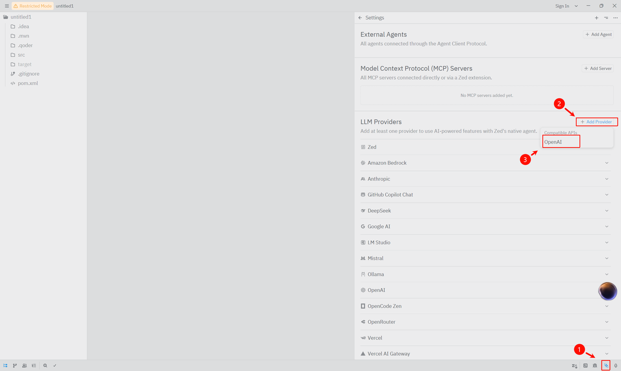 第一步: 打开 AI 对话面板,点击 Add Provider 按钮新增模型提供商,在弹出的提供商类型列表中选择 OpenAI 兼容。