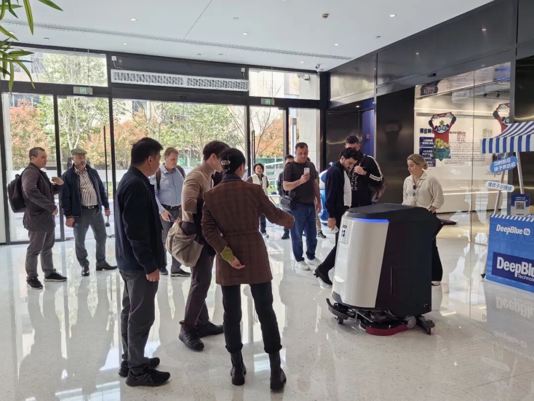 在深兰科技团队的介绍下,来访代表参观了企业展厅,系统了解公司围绕"基础算法---视觉大模型---具身智能---群体智能---智能装备"构建的人工智能技术体系。现场展示的多款智能设备均搭载深兰自主研发的视觉导航大脑,能够通过视觉感知与环境理解实现路径规划、自主决策与任务执行,在复杂环境中保持稳定运行能力。现场演示的清洁类智能装备,直观呈现了相关技术在真实场景中的落地效果,吸引来访嘉宾驻足交流。