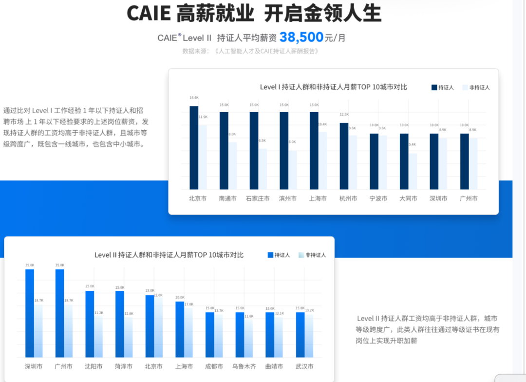 零门槛入门,不限专业:无论是文科、理科、工科,还是传统职能岗位,都可以从CAIE Level I 开始建立 AI 知识体系。优先录用优势明显:在银行、通信、先进制造、数字化转型企业中,CAIE 持证已逐渐成为简历筛选和优先录用的重要参考。职业前景直接:CAIE Level II 更偏向企业级 AI 应用与工程实践,适合想冲击高薪岗位的人群。实力见证:认证体系覆盖从认知、提示工程、工作流到 RAG、Agent、商业落地的完整链路,更贴近 2026 年企业真实需求,而不是停留在理论层面。