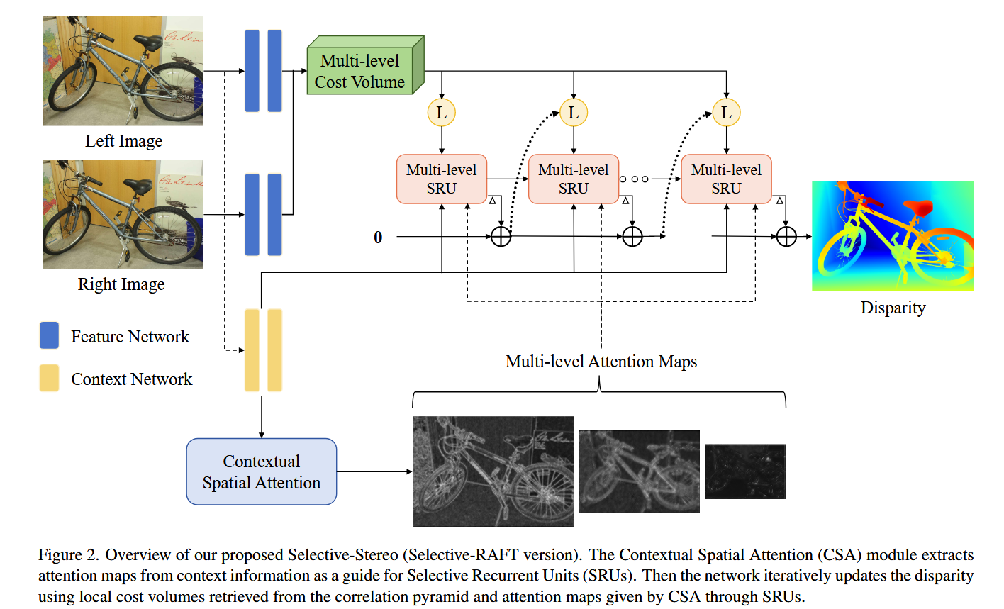 - [6.1 现有限制](#文章目录 @[toc] Selective-Stereo: 自适应频率信息选择用于立体匹配 论文总结 论文基本信息 一句话总结 0. 论文概述(Executive Summary) 1. 问题背景与动机 1.1 研究的重要性 1.2 现有方法的演进 1.3 现存的主要问题 2. 相关工作与创新关联 2.1 前人工作综述 聚合型立体匹配方法 迭代型立体匹配方法 频率信息应用 2.2 存在的问题与不足 2.3 本论文与前人工作的关系 3. 贡献与核心创新点 3.1 核心创新点一:Selective Recurrent Unit (SRU) 3.2 核心创新点二:Contextual Spatial Attention (CSA) 子模块1:通道注意力增强(Channel Attention Enhancement, CAE) 子模块2:空间注意力提取器(Spatial Attention Extractor, SAE) 4. 方法与网络设计 4.1 整体网络架构概览 4.1.1 网络的多级结构 4.1.2 多级结构示意 4.1.3 各模块功能概述 4.2 网络详细分析 4.2.1 特征提取模块详解 4.2.2 成本体积构建模块详解 4.2.3 Contextual Spatial Attention (CSA) 详解 4.2.4 Selective Recurrent Unit (SRU) 详解 4.2.5 损失函数与训练策略 4.3 核心创新的技术支撑 5. 实验结果 5.1 数据集与评估指标 数据集描述 评估指标 5.2 消融研究 5.2.1 模块有效性验证(表1:Scene Flow测试集) 5.2.2 通用性验证(表2) 5.2.3 迭代次数的影响(表3) 5.2.4 核大小选择(表4) 5.3 性能对比 **5.3.1 Scene Flow 基准(表5) 5.3.2 边缘 vs 非边缘区域分析(表7) 5.3.3 KITTI 基准排名 5.3.4 ETH3D 和 Middlebury(表8) 5.4 定性可视化分析 5.4.1 KITTI 上的视觉对比(图5) 5.4.2 Middlebury 上的定性结果和注意力图(图7) 5.4.3 不同网络的注意力图差异(图6) 5.5 反射区域(病态区域)的性能(表9:补充材料) 6. 不足之处与未来工作 6.1 现有限制 6.2 未来研究方向 7. 总体评价 7.1 研究价值 7.2 核心贡献总结 7.3 方法的优势 7.4 方法的劣势 7.5 研究的深远意义 附录:关键公式速查表 参考资源 讨论 一、CSA(上下文空间注意力模块) 🔷 子模块 1:通道注意力增强(CAE) 🔷 子模块 2:空间注意力提取器(SAE) 二、SRU(选择性循环单元) 🔶 标准 GRU 回顾 🔶 SRU 的核心改造 🔶 多级 SRU 结构 三、整体数据流总结 四、关键设计洞见 你的质疑是对的:Pool 本身不能判断频率 真正的推理链:从上下文特征到频率判断 第一步:上下文特征(Context Feature)天然编码了频率信息 第二步:CAE 做的是通道级别的"筛选放大" 第三步:SAE 做的是空间级别的"位置定位" 用一个直觉类比来理解 论文的直接原话印证 消融实验的间接证明 总结 SRU vs CREStereo RUM:基于原文的精准对比 先厘清"多个GRU"在各自框架里的真实含义 一、RUM 的"多GRU":级联粗到精 二、SRU 的"多GRU":单级内部的频率并行 三、成本体积的计算方式:另一个核心差异 四、设计动机的根本不同 五、一句话总结)