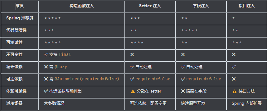 ❌ 代码冗长:每个依赖需要一个 setter 方法