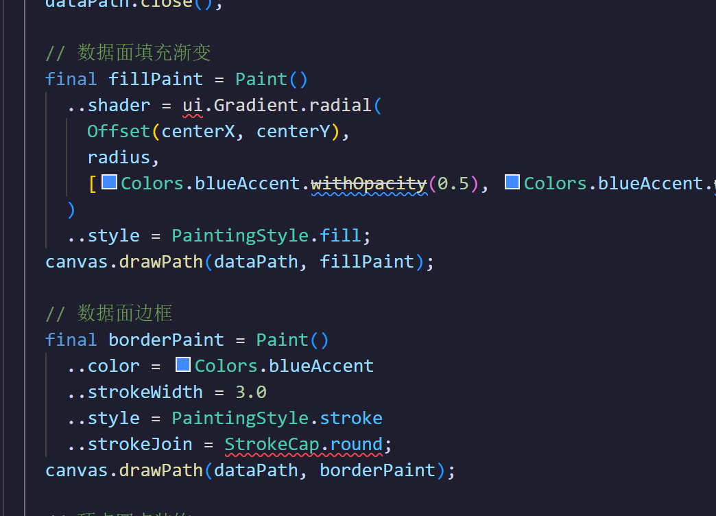 说明 :通过 ui.Gradient.radial,我们直接向 GPU 提交了一个着色指令,而不是依赖性能低下的 CPU 循环来计算颜色渐变。它要求提供中心系坐标 Offset 以及渐变半径 radius,底层的片元着色器(Fragment Shader)会自动在多边形内部按距离对每个像素点的色彩进行插值,生成出极具呼吸感、中心浓郁边缘透明的高级科幻视觉效果。