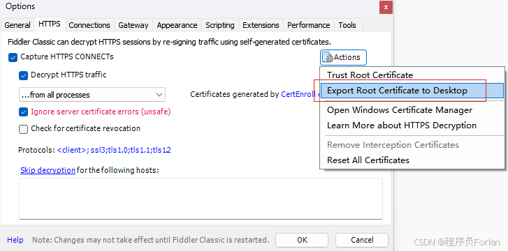 5.点击Actions,点击第二项:Export Root Certificate to Desktop,这时候桌面上会出现证书FiddlerRoot.cer文件,点击OK设置成功,关闭fiddler。