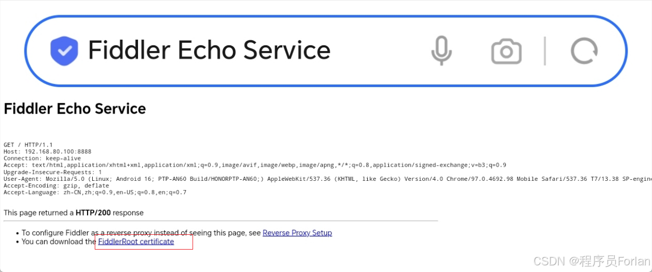7.下载fiddler安全证书,在浏览器输入电脑本地ip:端口号,例如:http://192.168.60.110:8888,点击FiddlerRoot certificate,下载证书安装接口