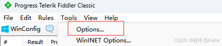 3.打开Fiddler,点击工具栏中的Tools--->Options