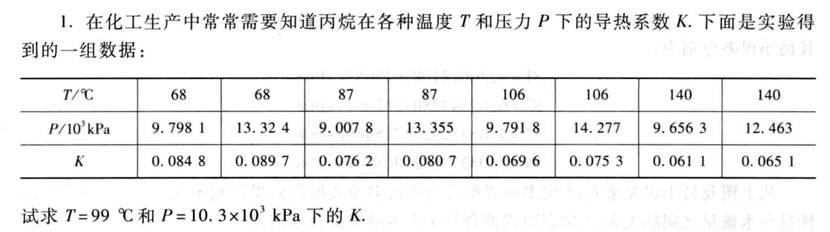 在化工生产中常常需要知道丙烷在各种温度 T 和压力 P 下的导热系数 K. 下面是实验得到的一组数据 : 试求 T=99 ℃和 P=10.3x10 ' kPa 下的 K.