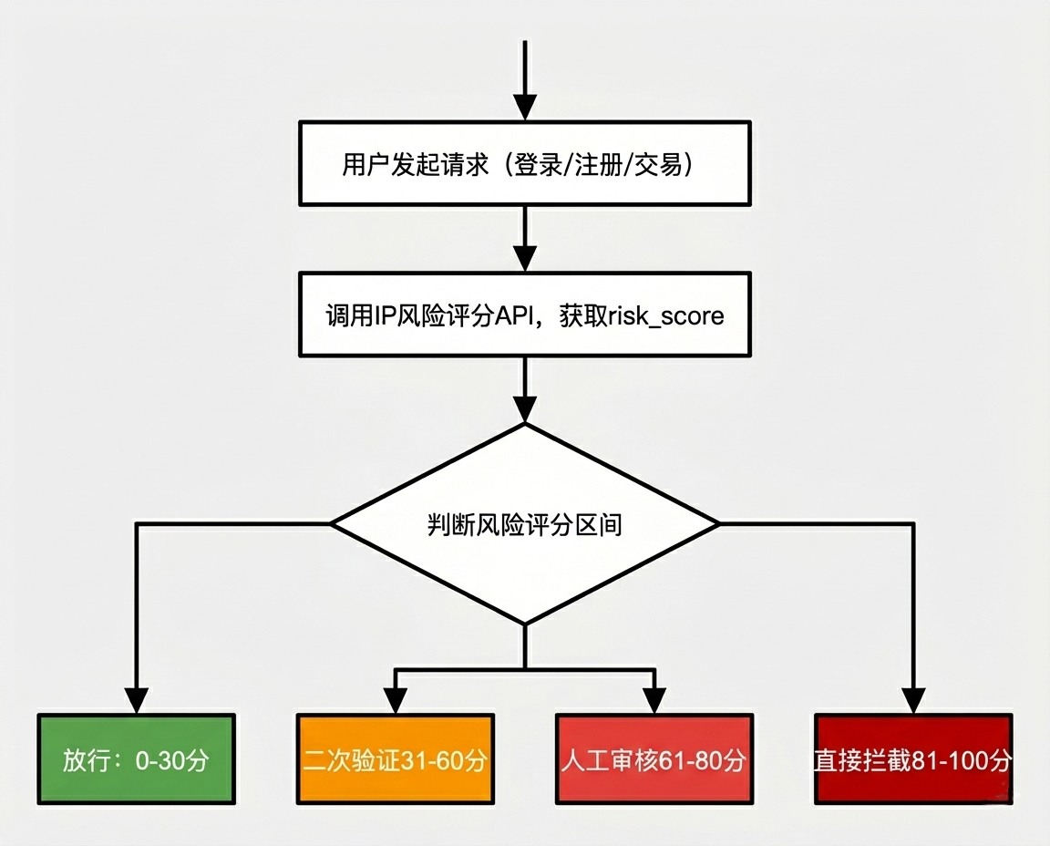 基于IP风险评分,风控系统可以构建分级决策流程。下图展示了从IP查询到最终动作的完整链路: