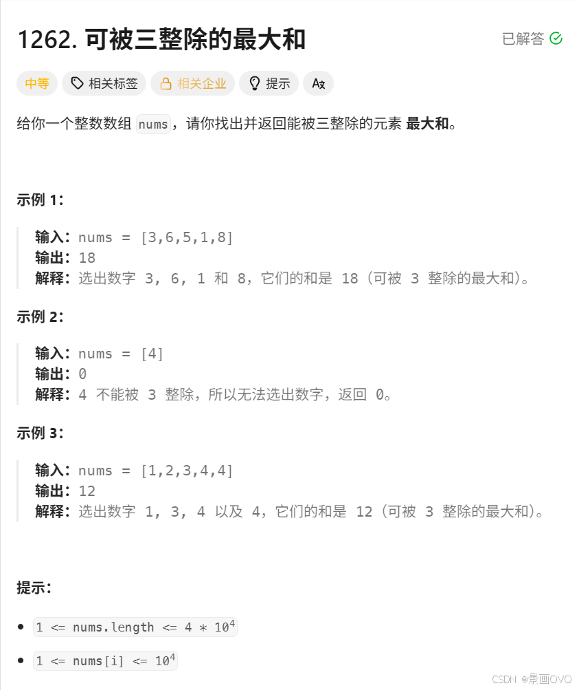 - [一. 力扣 [1262. 可被三整除的最大和](https://leetcode.cn/problems/greatest-sum-divisible-by-three/description/)](#一. 力扣 1262. 可被三整除的最大和)
