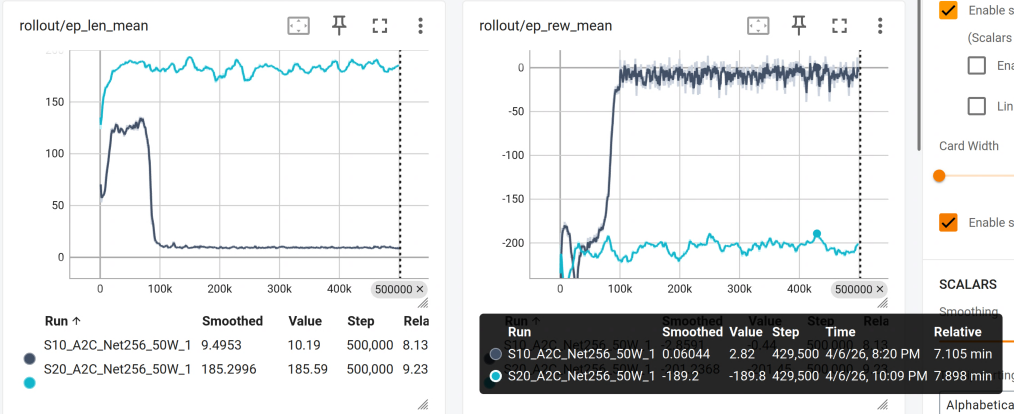 model.learn(total_timesteps=int(500000), progress_bar=True,tb_log_name='S20_A2C_Net32X32X16_50W')