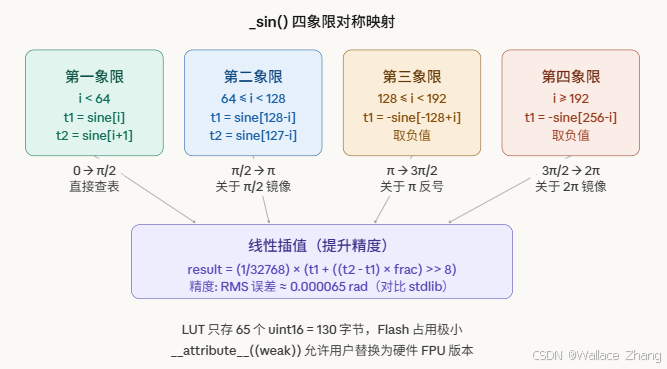 为什么是 65 个元素? 它只存储了第一象限(0 到 π/2)的正弦值,然后通过对称性推导其他三个象限。32768 = 2^15,对应 sin(π/2) = 1.0,所以实际精度是 1/32768 ≈ 0.000030。