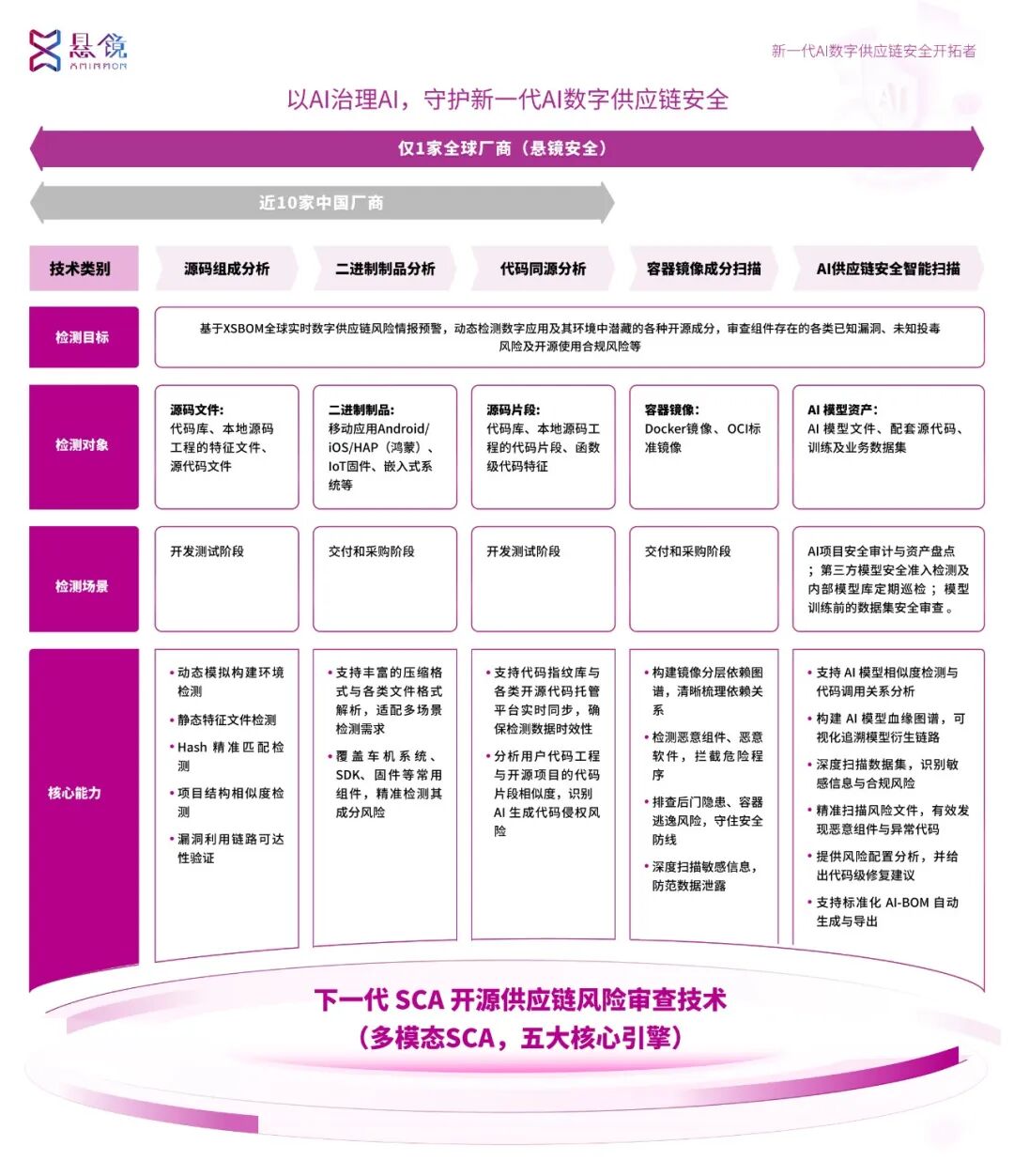 攻以守本,唯快不破!源鉴 SCA 深度践行悬镜"智能情报驱动,以 AI 治理 AI"核心技术理念,首创多模态 SCA 五大核心引擎,依托 AI 情报预警与 AI 模型安全扫描能力,全方位覆盖 AI 数字供应链各环节。在 AI 技术广泛应用、安全需求持续升级的新时代,以 AI 治理 AI 实现全域风险可视、全程可控,兼顾安全与效率,为企业 AI 数字供应链筑牢安全屏障,护航业务稳步前行!