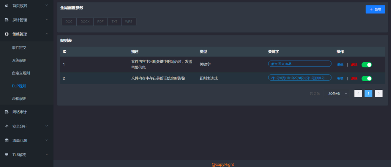 系统集成 DLP(数据泄露防护)模块,支持对网络中传输的图片、视频、JSON 文件、文本等进行还原和检测。通过敏感文件指纹匹配、内容特征分析等技术,可识别可疑数据传输行为。同时,针对恶意邮件,系统采用 AI 和大数据分析技术,检测邮件内容中的钓鱼链接、恶意附件及骗回复行为,并通过模型自学习不断优化检测性能。