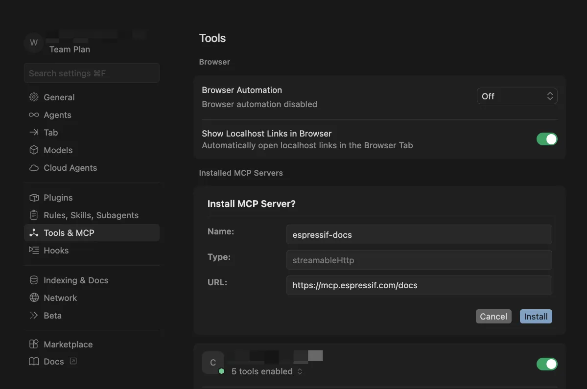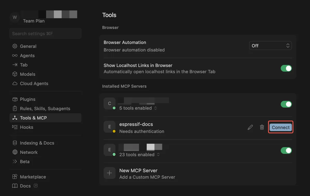 - Cursor:进入 Settings > Agents > MCP Allowlist。首次调用时 Cursor 会弹窗询问,授权即可。如果没有弹窗,则手动添加工具名,例如 espressif-docs: search_espressif_sources。