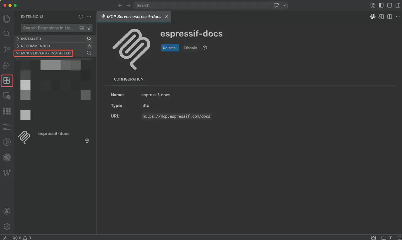 - 验证完成后,可以在 扩展 > MCP 服务器 -- 已安装 下看到已安装的 MCP 服务器。