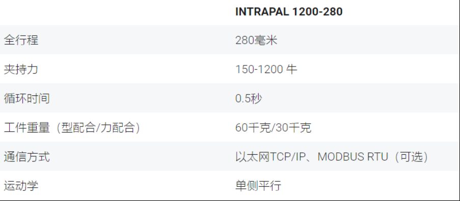 INTRAPAL 系列核心参数如下表所示,精简的参数设计兼顾实用性与适配性,适配多规格箱式物料抓取需求: