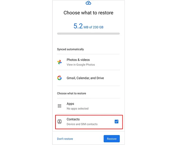 步骤 4: 在设置过程中,系统可能会询问您是否要从以前的设备或 Google 备份恢复数据。选择此选项。确保在要恢复的数据列表中选择"联系人"。