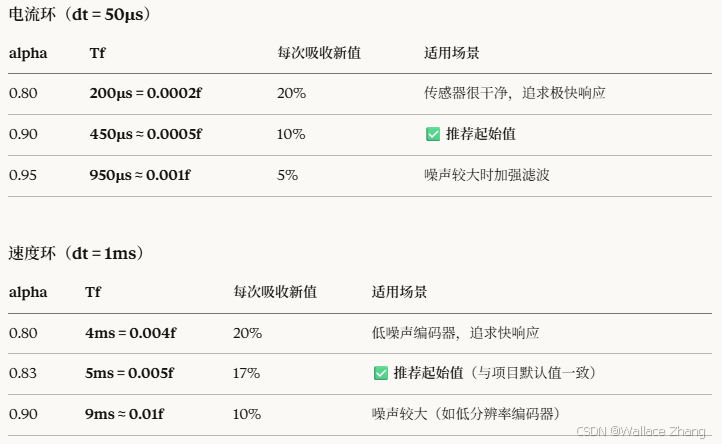 0.01f(10ms)用于电流,0.1f(100ms)用于速度
