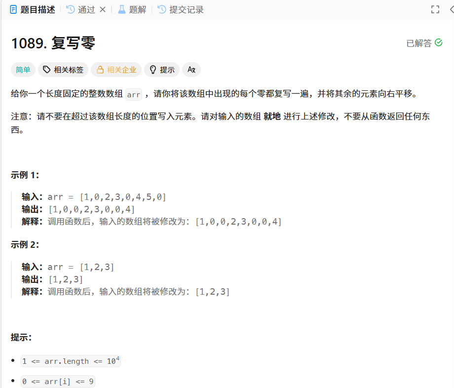 2.没考虑到特殊边界情况(最后一个复写元素为0时),以及处理方式不对