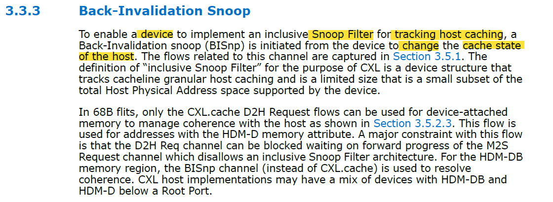 为了使设备 能够实现一个用于跟踪主机缓存的包容性监听过滤器,设备会发起 一个回写失效监听(BISnp)来更改主机的缓存状态,也就是在设备中有一个Snoop filter,记录主机中缓存了设备中的内存。