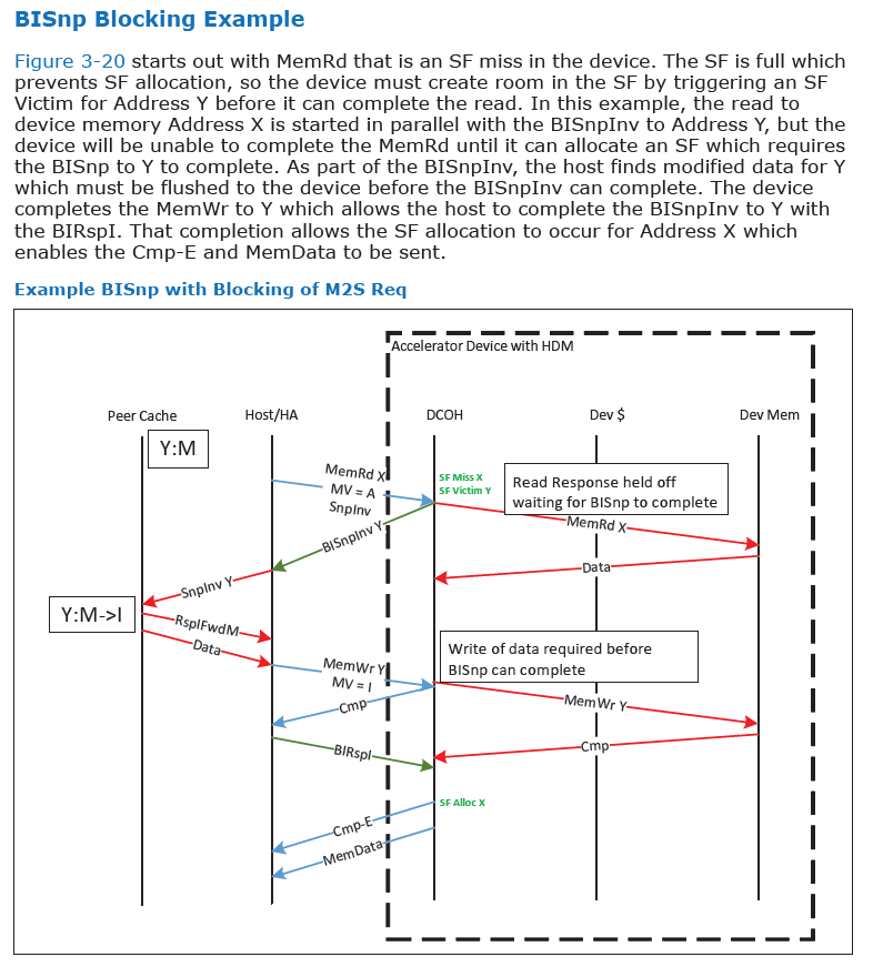 - 主机拿到Peer Cache回传的地址Y的脏数据,必须把这个最新数据写回设备内存的地址Y,否则设备内存里的Y是旧数据,引发错误。图中标注了Write of data required before BISnp can complete:这个写操作不完成,BISnp流程不能结束。