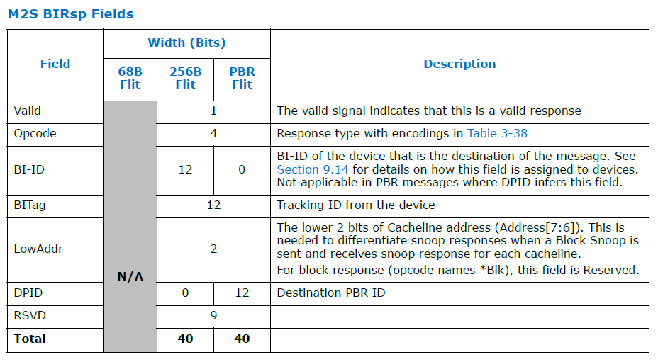 注意S2M BISnp消息格式,根据256B Flit模式和PER FLit模式,消息可能不同,差别在于采用PBR FLit模式,消息中有12bit SPID和12bit的DPID。