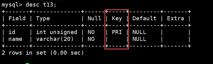 在字段定义后直接加上 primary key,该字段单独作为主键。
