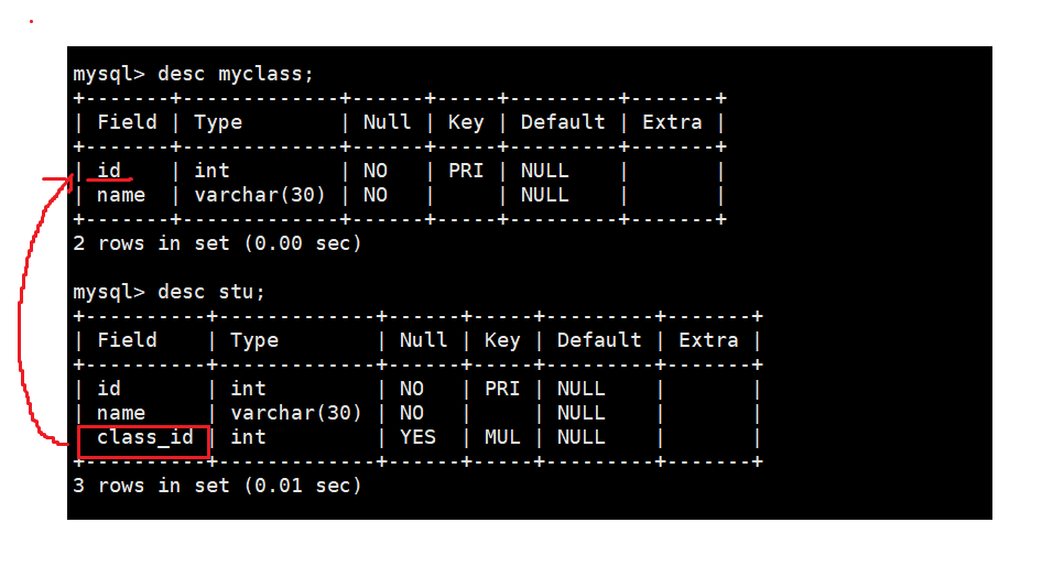 由表结构可知:外键用于建立从表(stu)与主表(myclass)的关联关系 ,并通过强制约束保证数据参照完整性。从表class_id作为外键,其取值必须在主表主键id中存在(或为 NULL),以此从数据库层面杜绝非法关联数据,确保两张表的业务逻辑一致性。