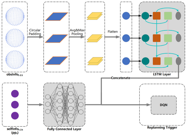 模块监控环境决定何时调用 Planner 更新路径,实现自适应平衡。状态空间包含连续三帧的自身与环境信息,以及当前路径进度 p p t pp_t ppt: