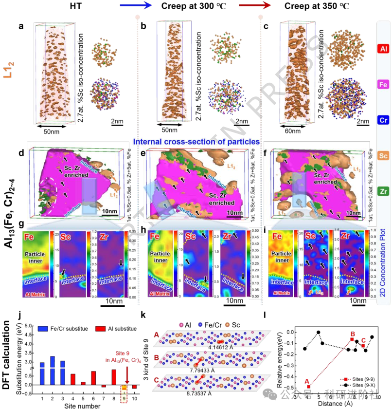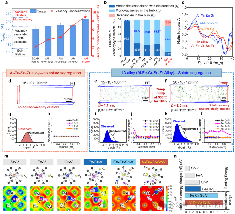 溶质-空位团簇:正电子湮没和APT证实,IA合金中存在大量V-Fe-Cr-Sc-V型团簇,密度高达10²⁵/m³,在300°C蠕变100小时后依然稳定。