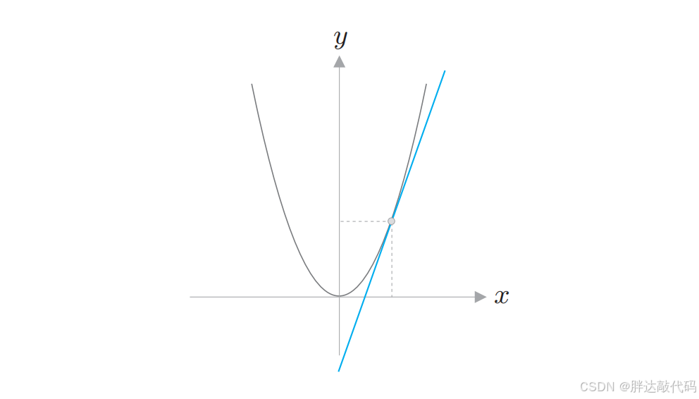 图中,灰色曲线代表了函数本身的变化趋势。对于蓝色切线,重点就在这条蓝线上。在某一个特定的点(图中那个小灰点),这条切线的斜率就是函数在该点的导数。如果你在曲线上的这个点放一个小球,小球滚动的瞬间方向就是这条切线的方向。导数的值越大,切线越陡,说明函数在该点增加得越快。