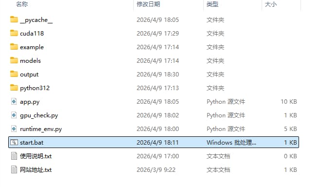 start.bat,无需手动配置 Python 环境或 pip install。 - 加载过程 :终端会显示 CUDA 初始化进度,等待提示"服务已启动"后,浏览器会自动跳转至