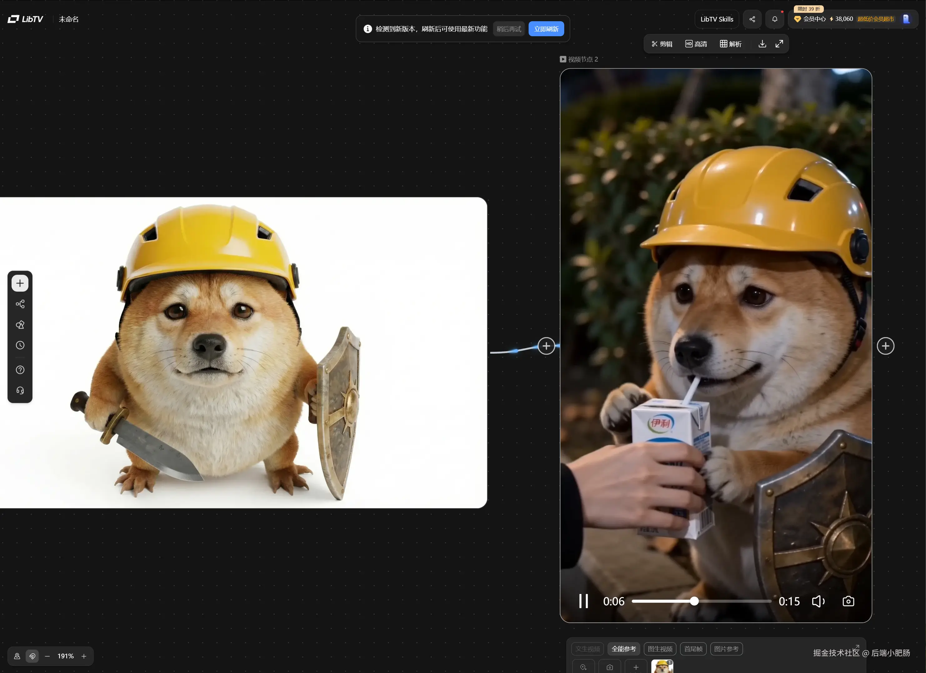 将skill 生成的提示词做一下人工审核(这里必须要做,AI全自动生成的提示词有时候会存在细节不到位的情况,需要人工微调,提示词写的越精准也可以很大程度减少抽卡),直接粘贴到libtv 里面用Seedance2.0 Fast生视频,这里我把刀盾狗的角色做了一下固定,纯靠AI文字描述生成出来的刀盾狗形象不对: