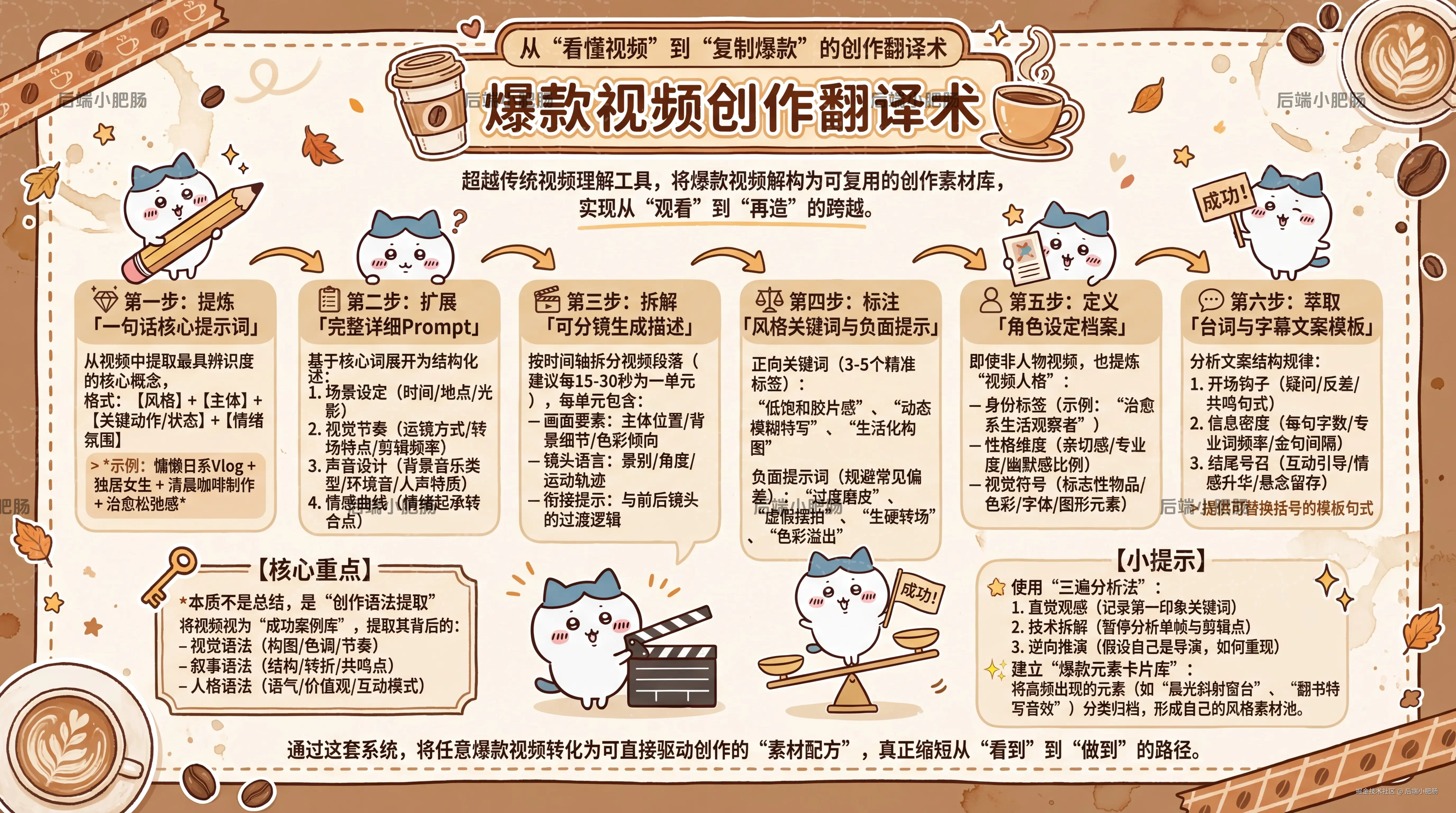 我做这个 skill,并不是单纯想做一个"视频理解工具"。因为现在很多模型都能大概总结视频内容,告诉你视频里有谁、发生了什么、画面是什么风格。但这些信息离"我能不能继续做出一个类似风格的视频",中间其实还差很大一截。我真正想要的是把一个爆款视频尽量翻译成一套可复用的创作素材。包含以下核心内容: