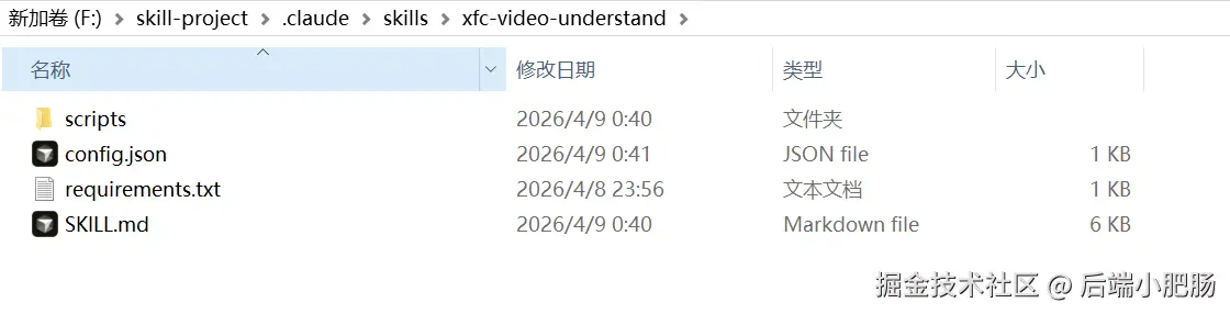 在实现上,我把xfc-video-understand逻辑全部收敛到了一个核心脚本里。话不多说,先看这个 skill 现在的目录结构: