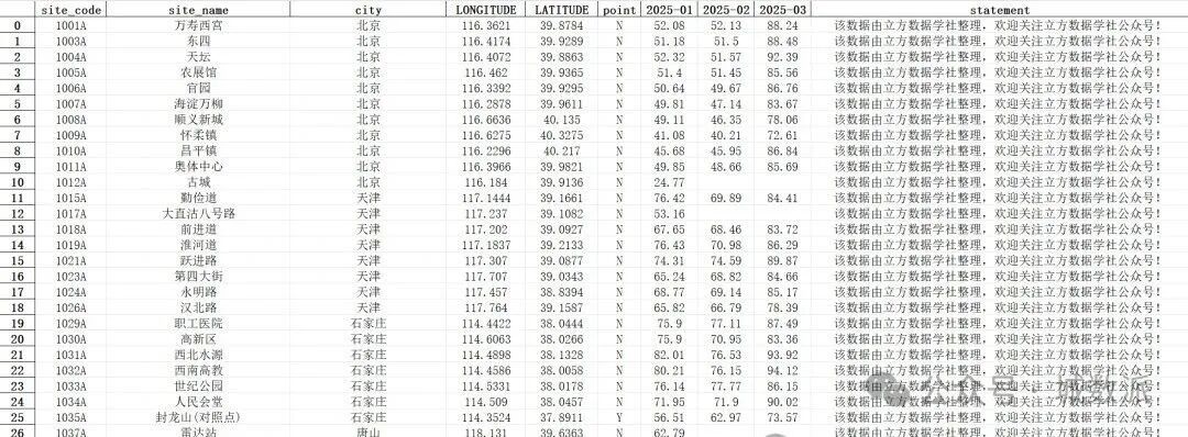 之前我们分享了2014-2025年全国监测站点的逐时、逐日、逐年的空气质量数据,包含15个指标,提供了Shp和Excel两种数据格式。本次我们分享的是基于逐时的数据得到的1600多个监测站点的**逐月的空气质量数据!**计算方法为求得当月所有时刻空气质量数值的平均值,具体包括15个指标,时间范围为2014年5月13日---2025年12月31日,数据格式为Shp和Excel两种!