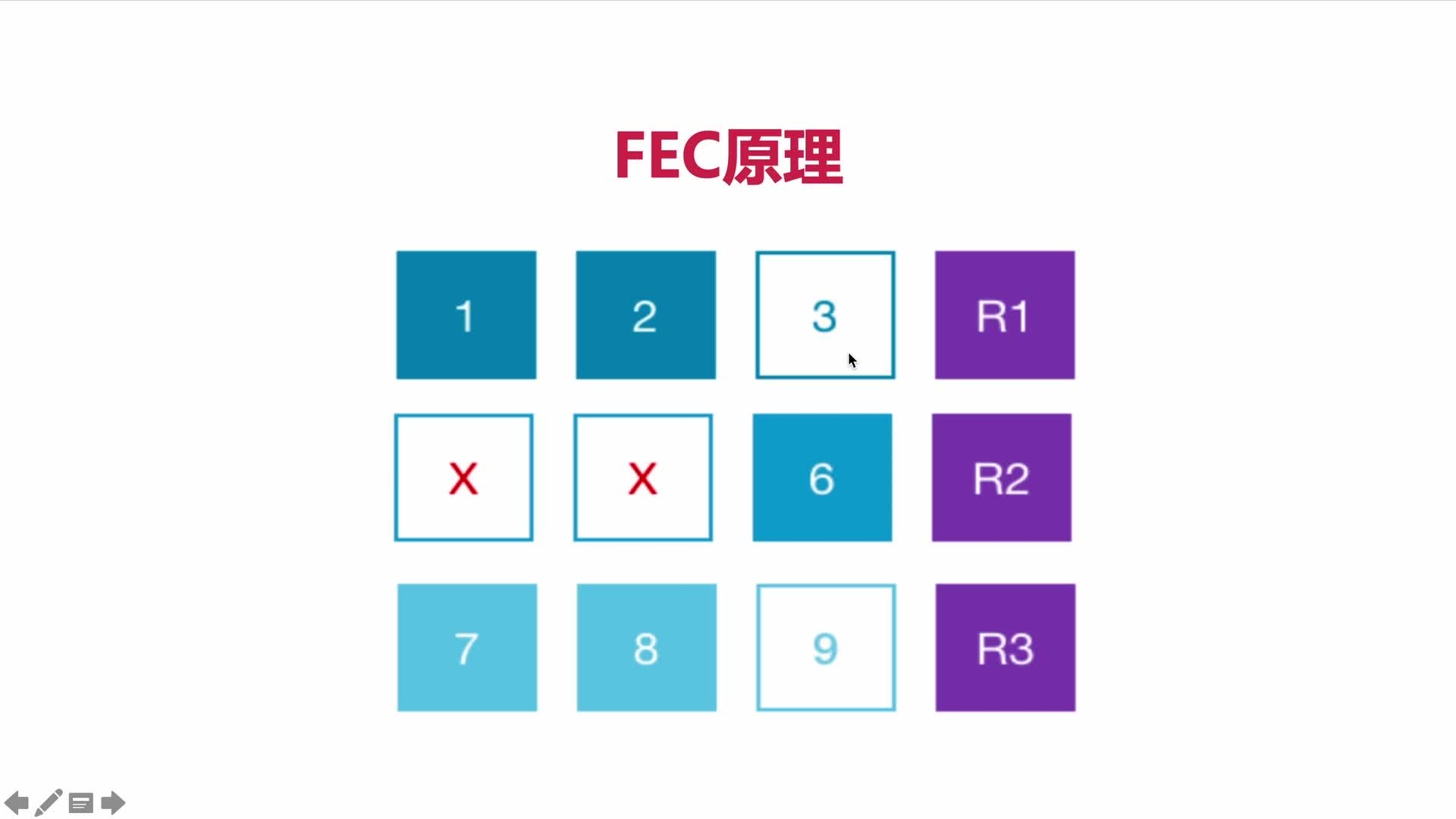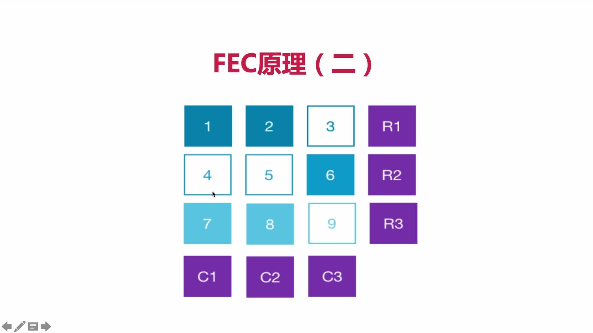 上图所示,横向来看,3个包分别做异或操作,得到冗余包R1,R2,R3。当丢失一个包时,可以通过冗余包与另外两个包恢复。