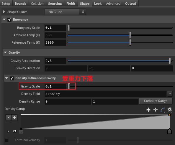 想让smoke下沉时,可设置负温度或勾选Density Influence Gravity;