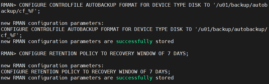 CONFIGURE CONTROLFILE AUTOBACKUP FORMAT FOR DEVICE TYPE DISK TO '/u01/backup/autobackup/cf_%F'; -- 固定目录
