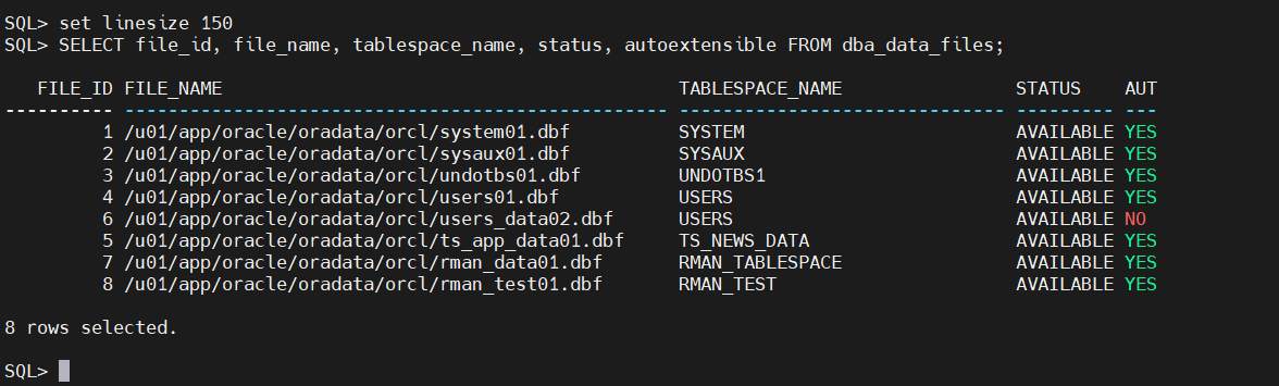 CREATE TABLESPACE rman_test DATAFILE '/u01/app/oracle/oradata/orcl/rman_test01.dbf' SIZE 10M AUTOEXTEND ON NEXT 5M MAXSIZE 32766M;