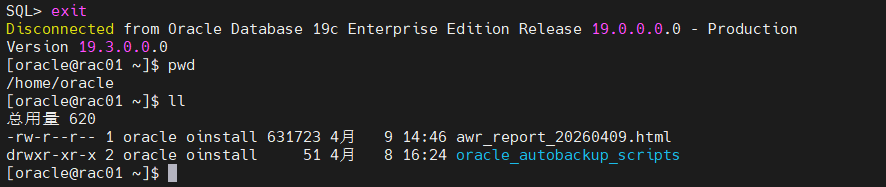 你可以在当前 sqlplus 所在的路径下找到生成的报告文件(例如 awr_report_20260409.html),使用 ls 命令确认后,通过远程工具将其下载到本地,用浏览器打开即可查看。
