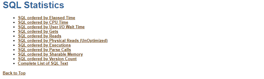 位置: Main Report -> SQL Statistics -> 重点关注SQL ordered by Elapsed Time和SQL ordered by Cpu Time。