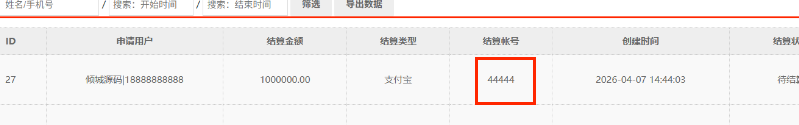 提交后我们去刷新后台看数据,然后就会看到提现申请中多了刚刚申请的内容,结算账号就会显示我们刚刚写的结算账号,然后对应的结算金额